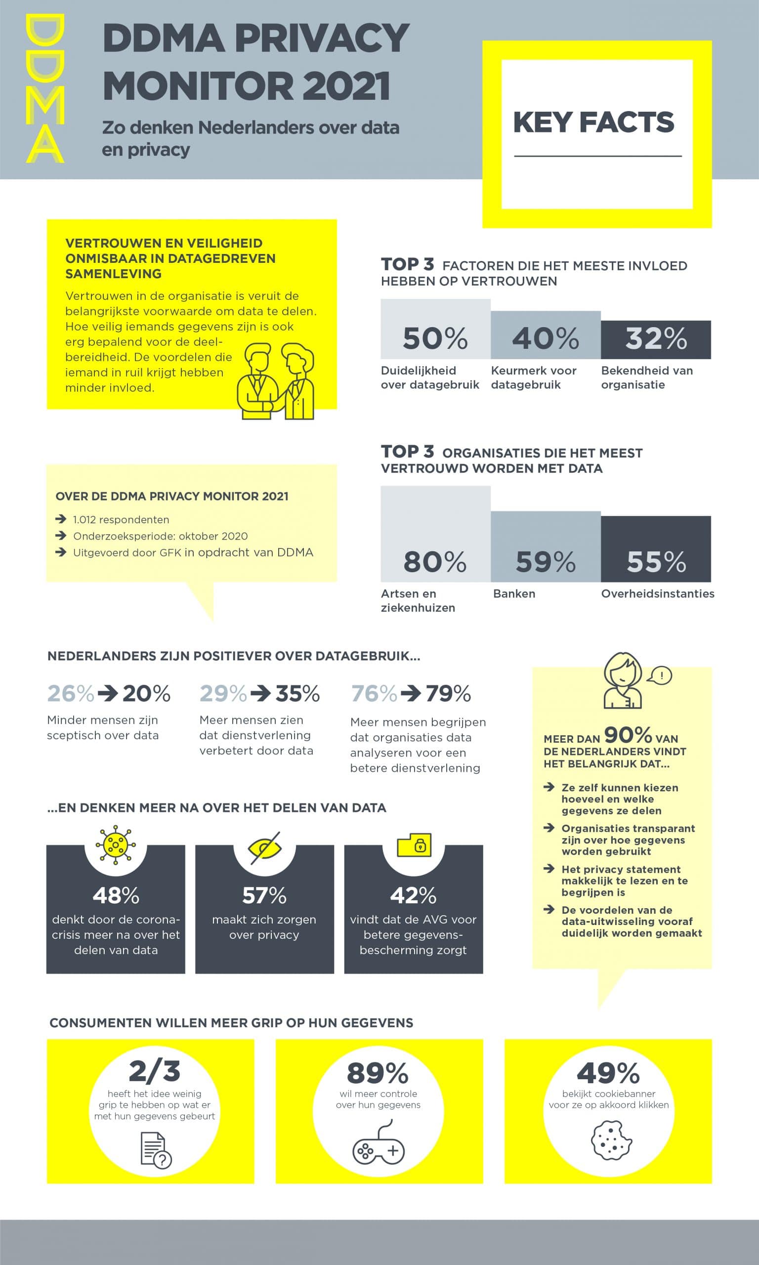 Vertrouwen in een organisatie is de basis voor het delen van persoonlijke informatie. 40% noemt vertrouwen als allerbelangrijkste reden om data te delen (in 2019 was dit 37%), bij 55% staat vertrouwen in de top drie. Duidelijkheid over hoe de organisatie omgaat met data heeft het meest invloed op dit vertrouwen (50%), gevolgd door het hebben van een keurmerk dat aantoont dat een organisatie goed omgaat met data (40%) en de bekendheid van een organisatie (32%). Artsen en ziekenhuizen (80%), banken (59%) en overheidsinstanties (55%) genieten over het algemeen het meeste vertrouwen wat data-uitwisseling betreft. Het vertrouwen in online diensten is dit jaar flink gestegen.